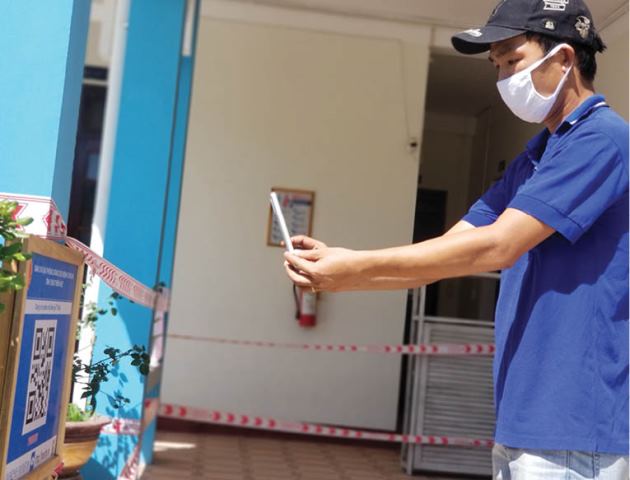 The worker of Thua Thien Hue Wood Processing Joint Stock Company scanned the QR code before entering the shift