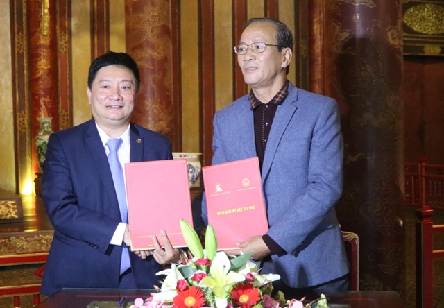 The sponsor and Chairman of Huong Tra Town People's Committee (right) agree on the commitment of sponsoring and implementing the project of upgrading the road to King Gia Long's Mausoleum