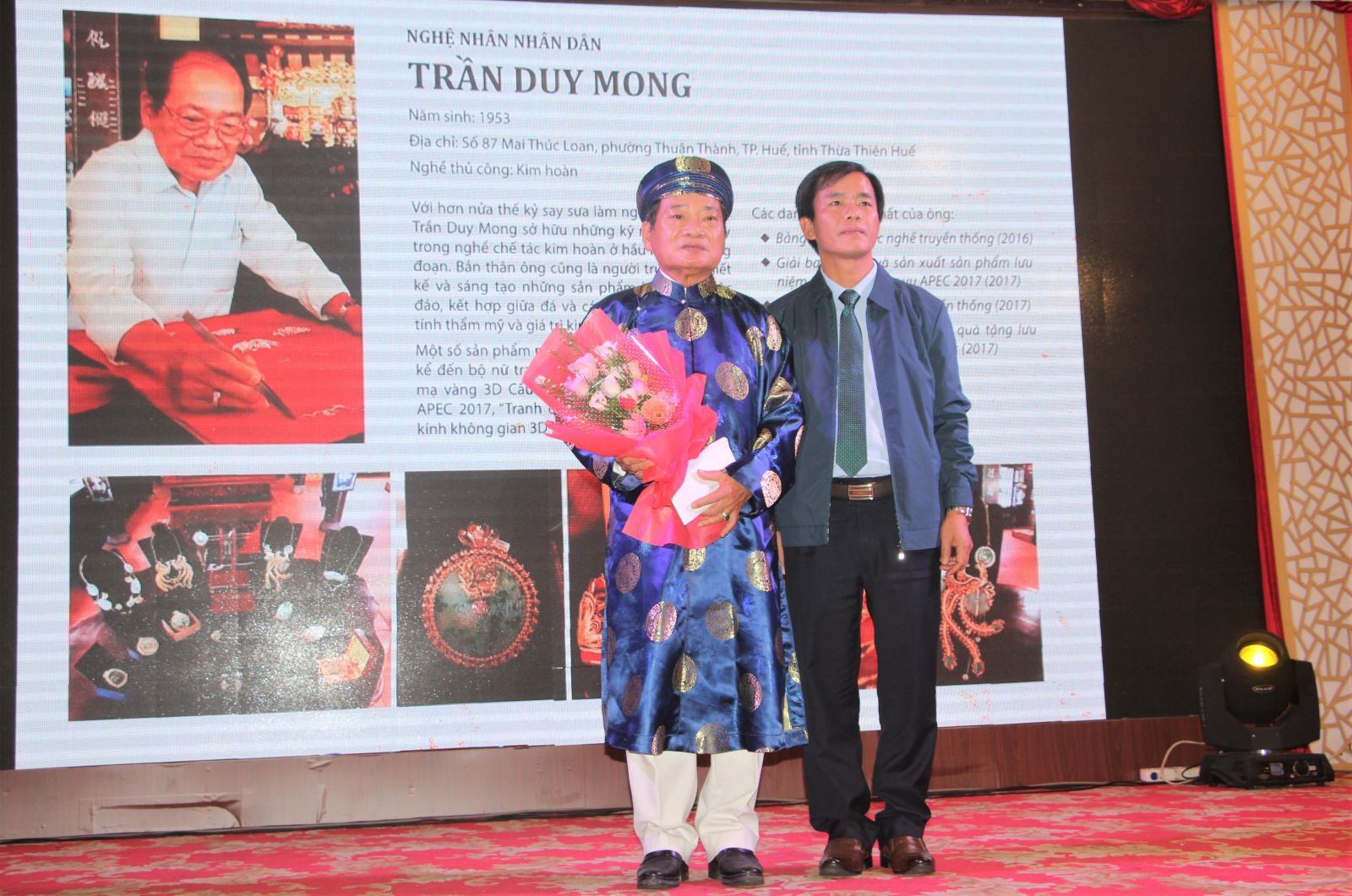 Vice Chairman of the Provincial People's Committee, Mr. Nguyen Van Phuong presented flowers to congratulate artisan Tran Duy Mong, who had just been awarded the title of People's Artisan by the President.