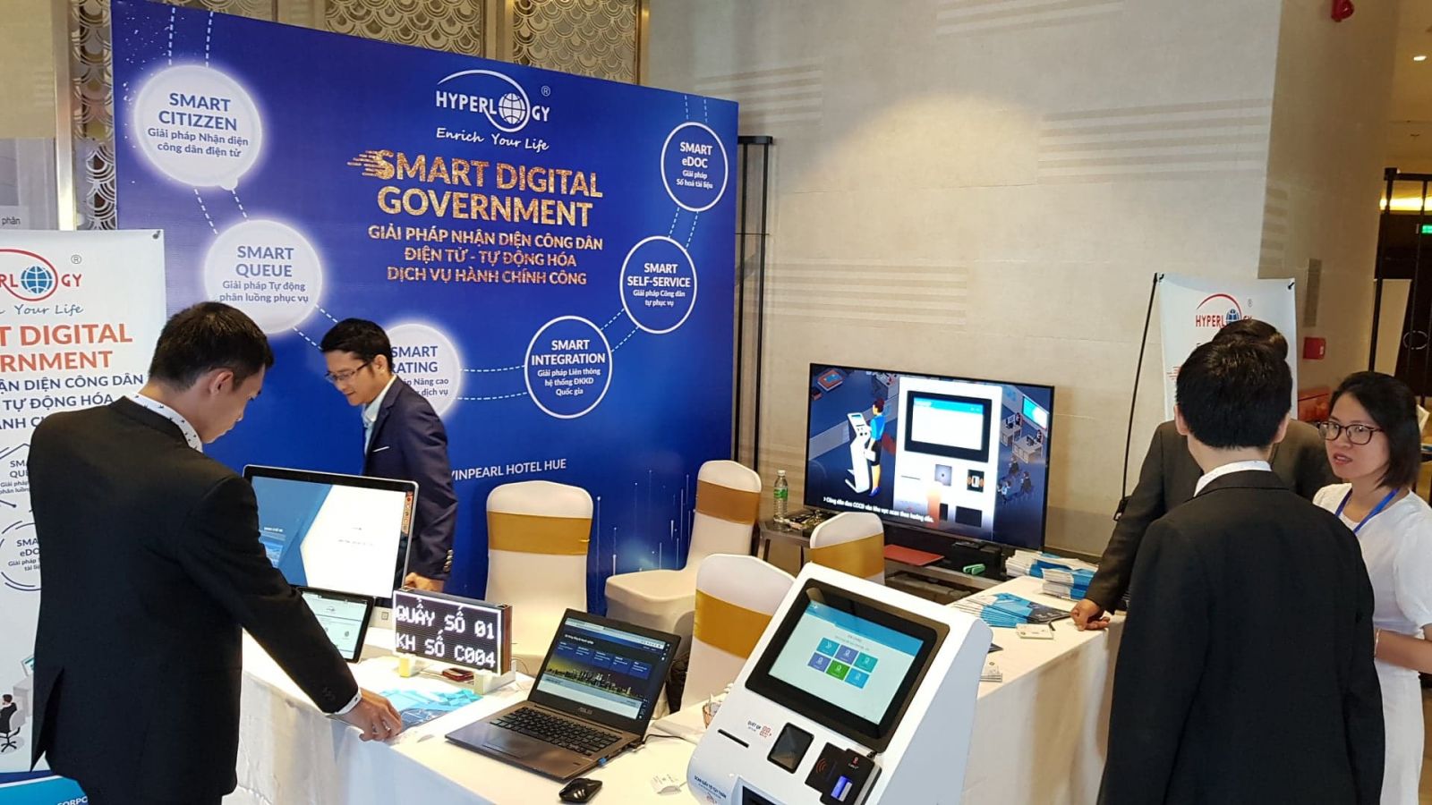 HNN.VN - An expo showcasing technological achievements for the construction of system infrastructure, e-Government development solutions and non-cash payment technologies for the implementation of the national public service portal, smart city solutions, was held in parallel with the national e-Government conference at the 6th floor of Vinpearl Hue Hotel.