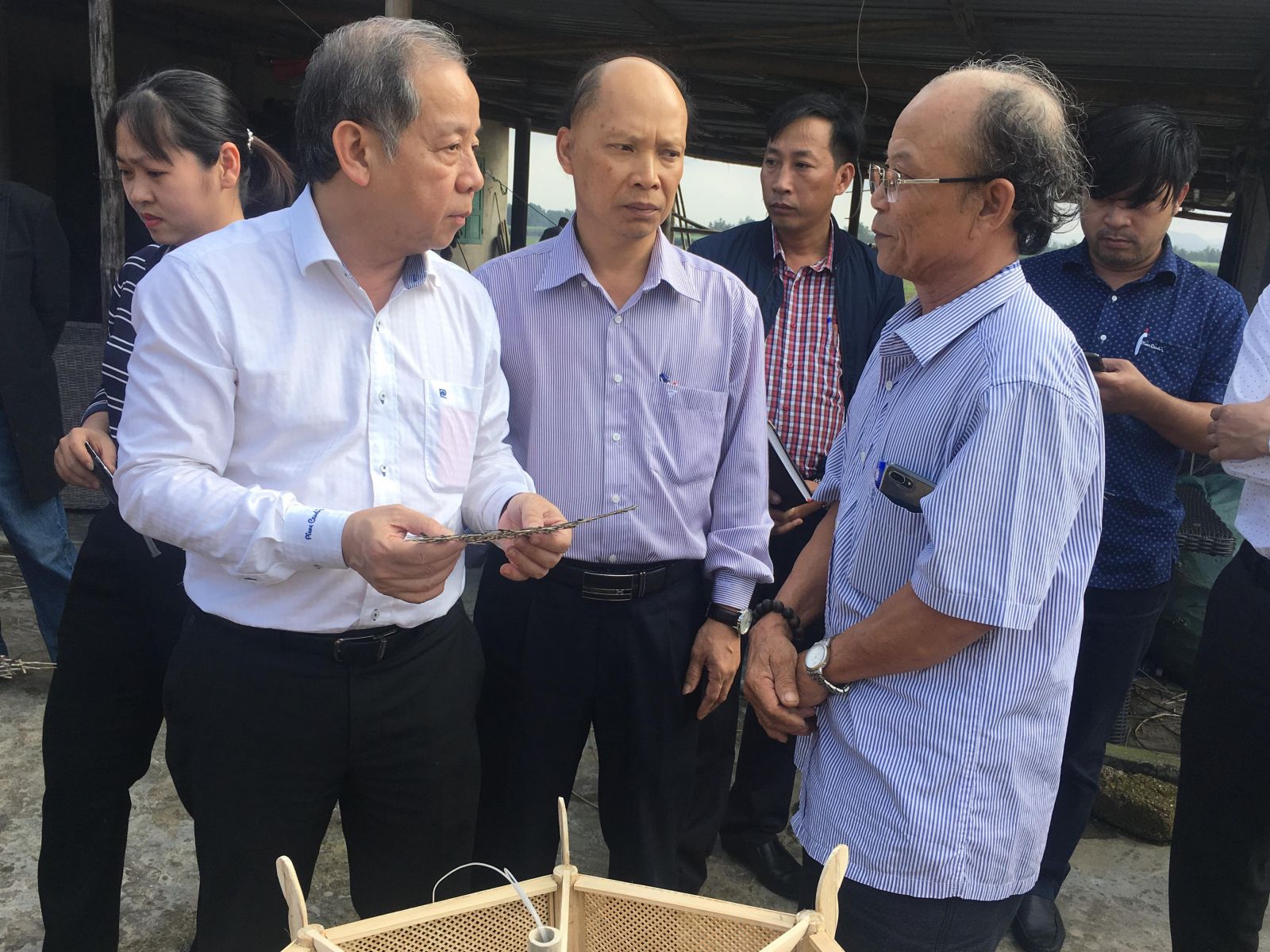 Chairman of the Provincial People’s Committee Phan Ngoc Tho checks the production activities at Bao La Bamboo and Rattan craft village