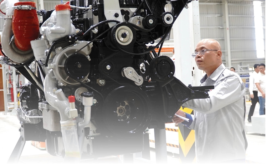 | Workers at Kim Long Motor Hue JSC inspecting the technical specifications of a newly launched YUCHAI engine |