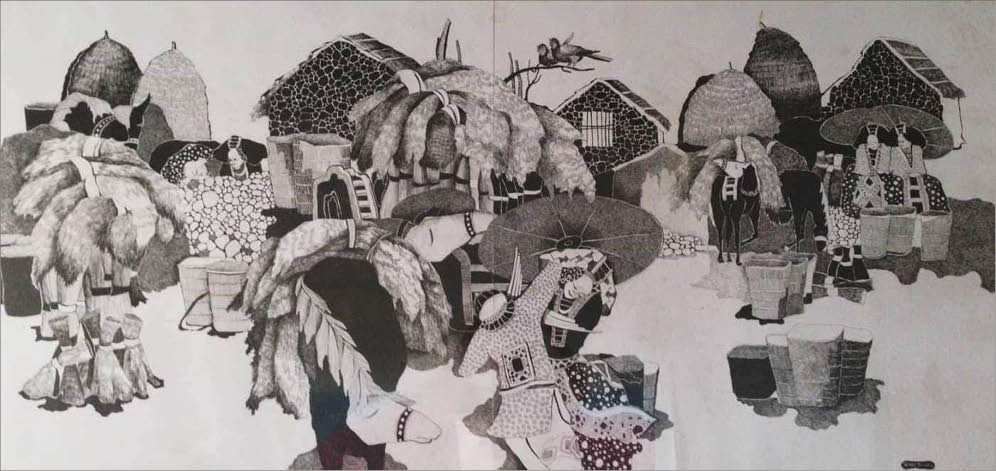 With typical black and white of the pen-nib art, the drawing shows his emotion as well as the technical meticulousness, which enables the viewers to feel the bustle of the North-Western mountains.