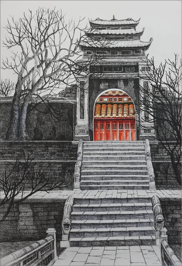 Later, he changed to realistic drawings with colors. In the work The Golden Age about Minh Mang Tomb, for example, the black symbolized the ancient past, the red of the gate highlighted the picture, provoking a remembrance of the glorious Nguyen Dynasty.