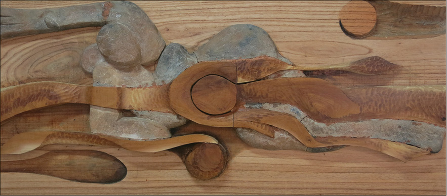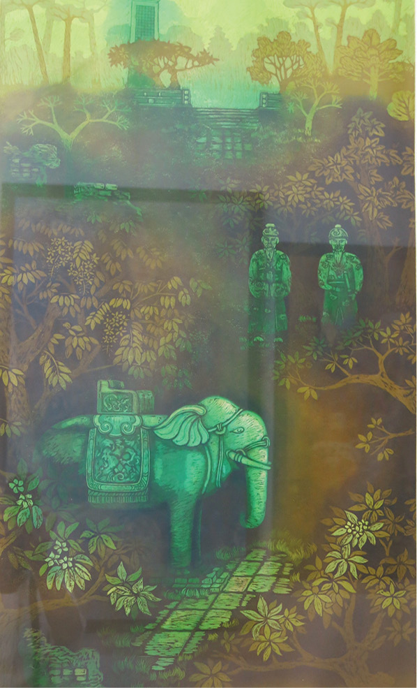 "Tu Duc Tomb" by Nguyen Quang Man is a trio of works expressing the beauty of nature in Tu Duc Tomb with wood carving. The scenery and architecture of this relic were created with images superimposed on each other, creating depth and distance. The viewer can feel like he/she is strolling along the tomb of Tu Duc.