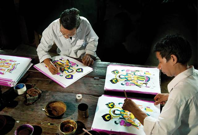 Sinh paintings are printed on poonah-paper. Villagers have to go as far as Quang Binh to buy this kind of paper. After Tet holiday, on the tenth day of lunar year, there is a village wrestling competition to find out the strongest men. These people will go and search the Indian redwood and the Japanese pagoda tree in the forest, and the noble scallop in the sea to dry and pulverize to make colors for painting.