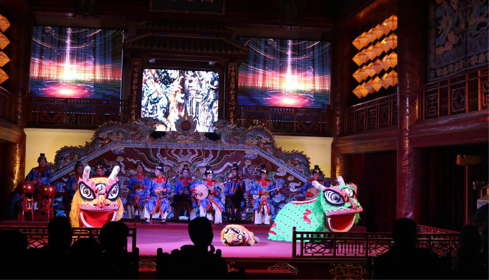 On the first performance of the opening night of the “Royal Traditional Art”, the number of guests did not fill 80 seats as expected. However, gradually, the vacant seats are partly covered by rhythms, dances, classical drama extracts, and even serious actors from the stage. Whether the seats are full or not, the performance time starts, the lights is off and the music plays. Six performance items include the ballet "Lân mẫu xuất lân nhi" (A mother unicorn gives birth to her young), the ballet “Tường trình tập khánh”, the ballet “Lục cúng hoa đăng”, the traditional folksong “Cảnh đẹp Huế đô” (Hue ancient capital’s beautiful scenery) and the symphony “Phú lục địch