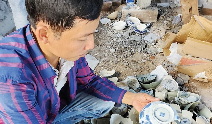 | Artisan Nguyen Thanh Thuan by the broken bowls purchased for the ceramic mosaic to restore dragons and phoenixes at Thai Hoa Palace. Photo: Bui Ngoc |