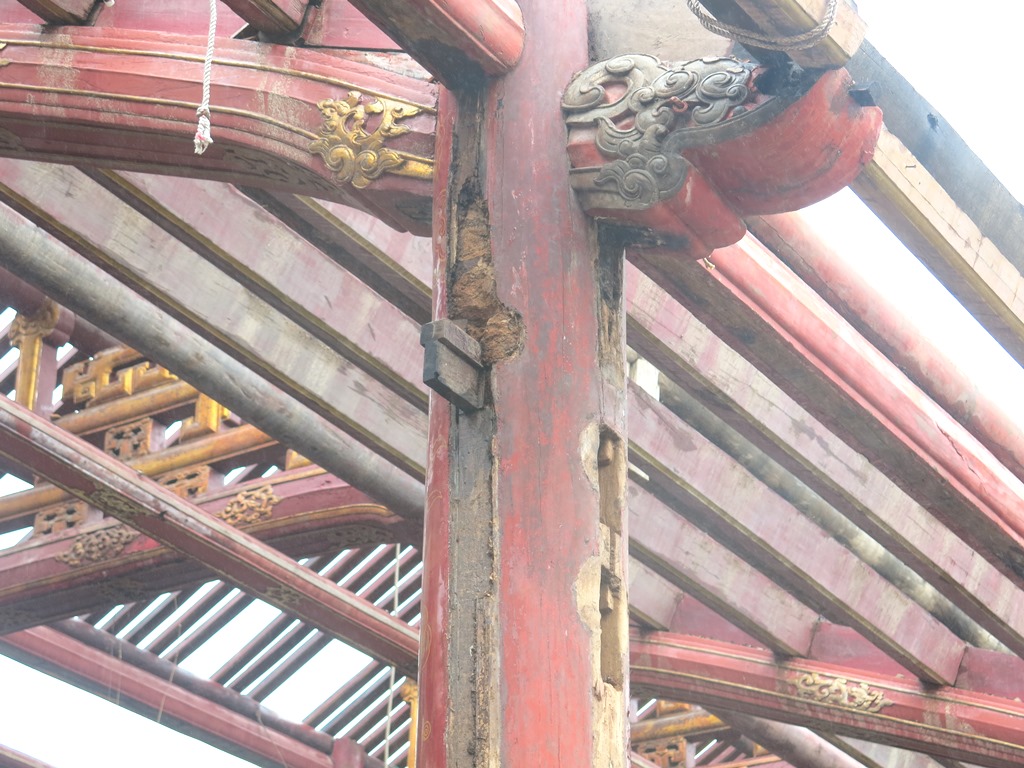 Regarding the components assessed as completely damaged, new restoration is required. Less damaged ones will be cleaned and patched with mortise, girder reinforcement, plinth, rafter tails and rafter ends. As for good components, they will be cleaned and reused.