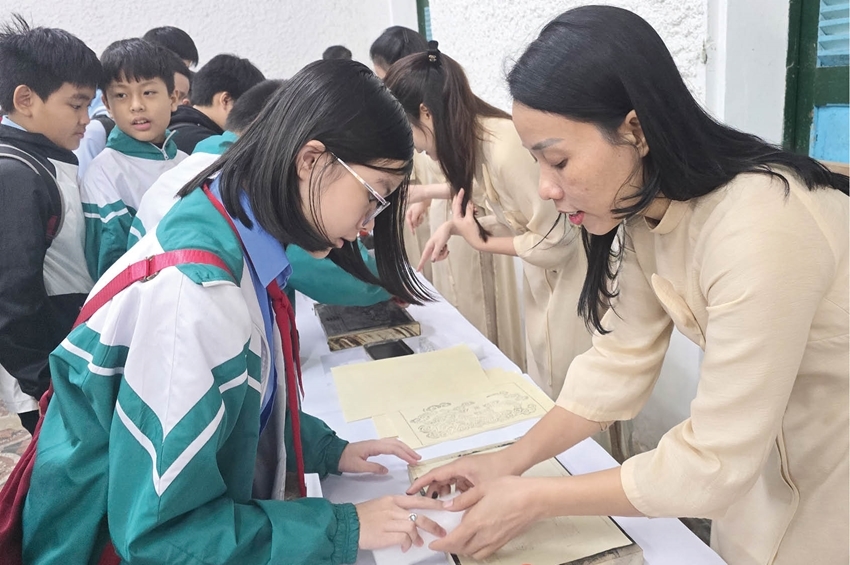 | Hands-on guidance for students in printing Nguyen Dynasty decorative woodblocks |