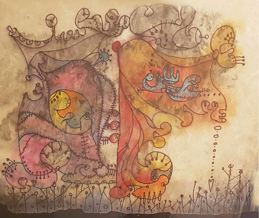 “Confluence with Lotuses” has been his theme for a long time done with various materials and techniques such as painting, graphics, media and truc chi. But this time, Bang returns to paper, but with a completely new message. Most of the paintings are in watercolor or ink with markers on dướng paper in addition to some of truc chi as the end of his experiment with paper made from different kinds of fiber which are characterized by their blurring of color and ink.