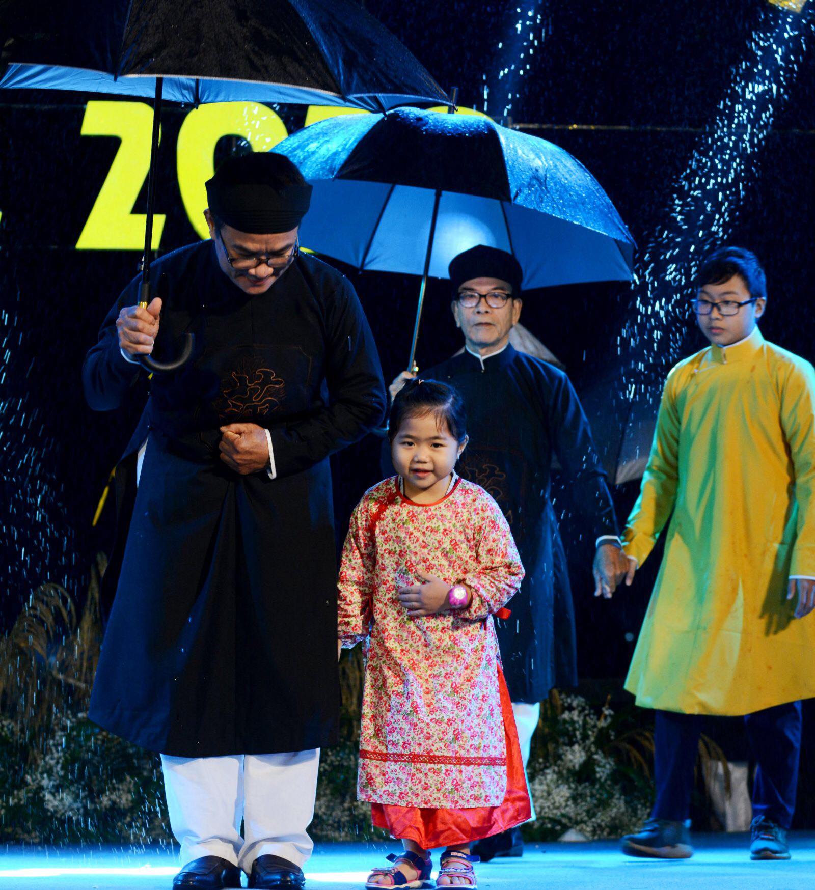 Taking place on the bank of the Perfume River at Nguyen Dinh Chieu pedestrian street, the opening program opened with the collection "Silhouettes through the periods" by the designer Quang Hoa. With the idea of recreating the image of aristocratic ladies going to the palace banquet, Quang Hoa brought the image of the procession in Nhat Binh dresses and traditional male and female five-panel ao dai, going through historical periods to today.