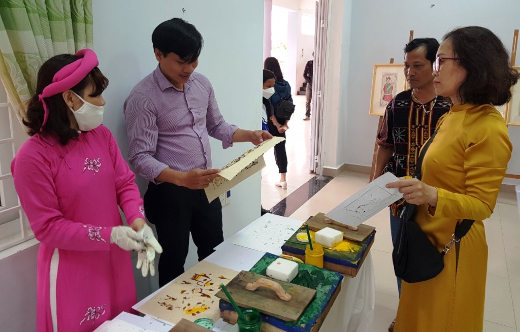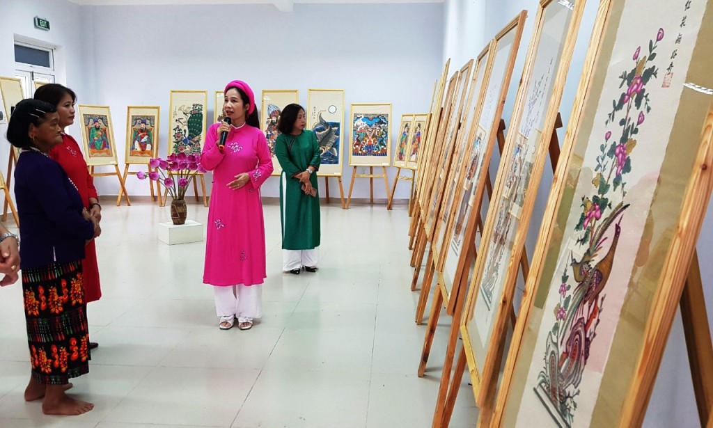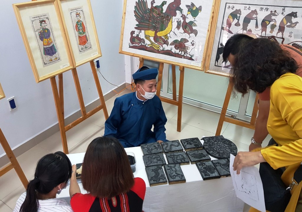 Ethnic people in the province displayed, performed, and made traditional handicraft products such as Zeng weaving, knitting, mat knitting, rattan chair making, etc. In addition, there is also an exhibition space on the theme of “Người đi tìm hình của nước” ("The person who searched for the shape of the nation"), as well as the exhibition space to experience Dong Ho paintings, and Sinh village paintings.