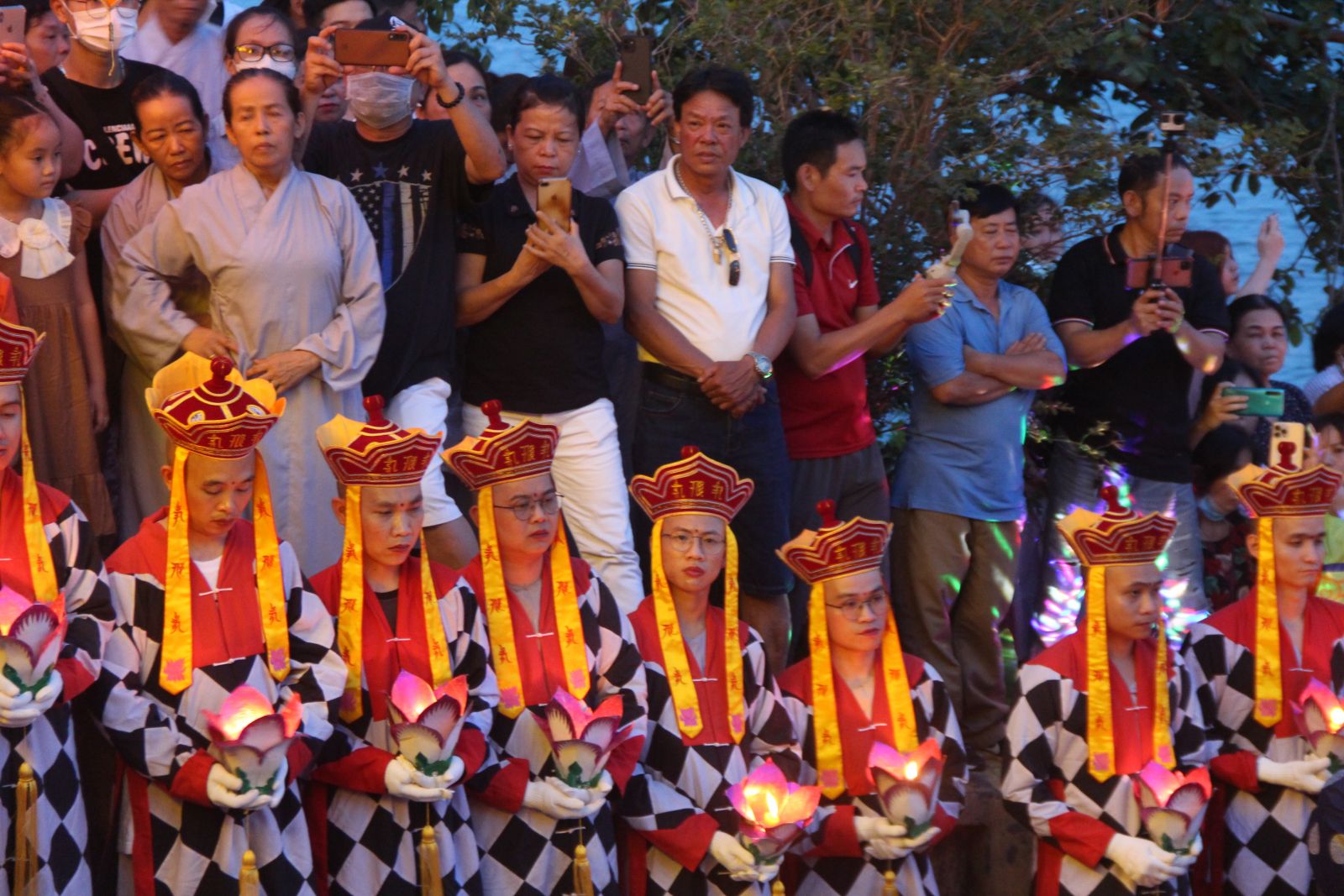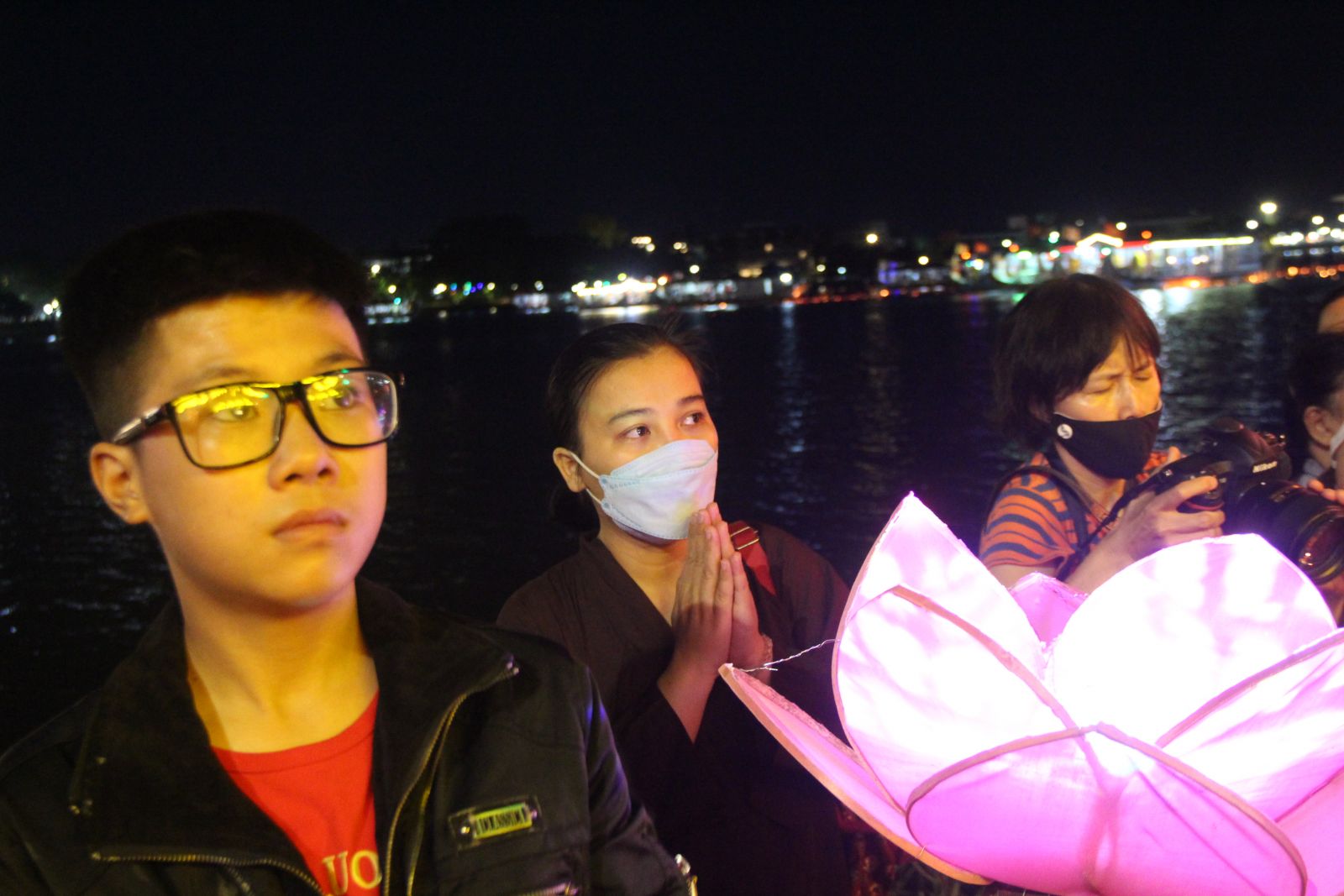 Monks, nuns, Buddhists, and guests attending the festival of releasing 20,000 flower garlands and colored lanterns into the Huong River. The ceremony of dropping the flower garlands and colored lanterns is to pray for the country to be peaceful, for the people to live in peace and happiness, for the world to be free from wars - natural disasters - pandemics, and for sentient beings to be at peace.
