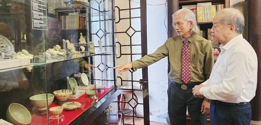 Lam Du Xenh brings his collection of nearly 40 artifacts including stone Buddha statues, pottery and ceramics with sophisticated patterns and bronze mirrors dating back thousands of years ago, which he collected from shipwrecks in the Central waters.