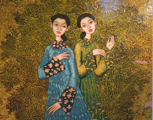 Some authors portrayed autumn in various subtle hues. While the two artworks of Dang Thu An, “Hoa nắng” (Flowers in the sun) featured the image of flowers in brightest yellows, Ngo Tam’s “Hương sen” (Lotus scent) with warm colors depicted a sense of purity and elegance. Pham Hoang Anh's artwork “Thiếu nữ Huế” (Hue’s young ladies) portrayed the simplicity and grace of two Hue ladies in the symbolic ao dai (Vietnamese traditional dress).