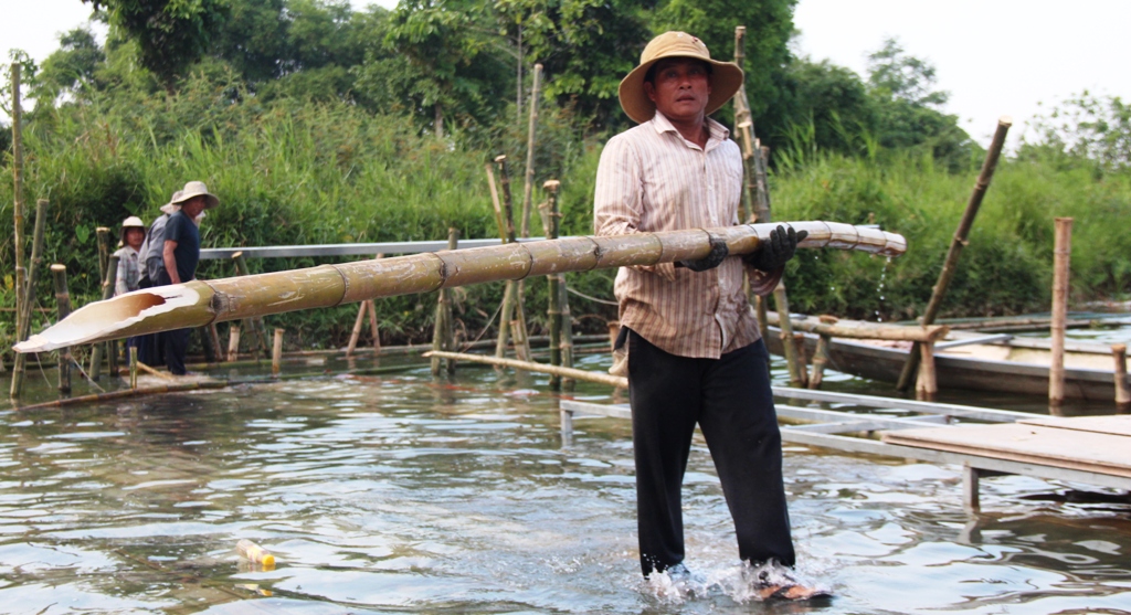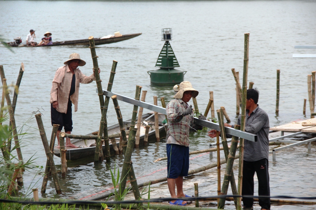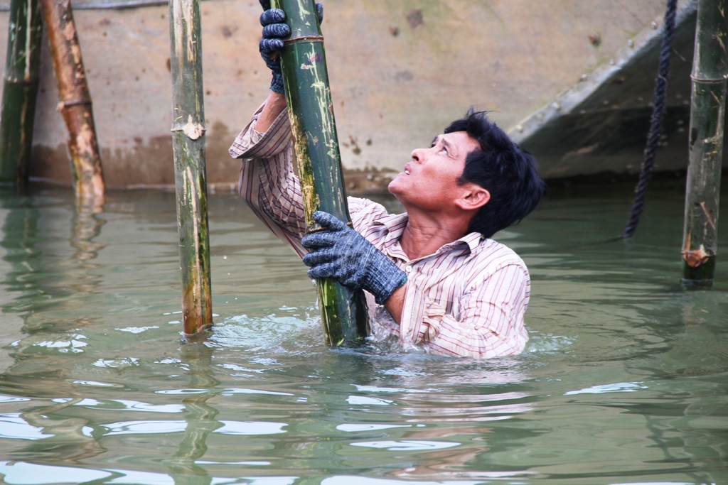 Many workers have to work under the water to drive the bamboo poles into the riverbed
