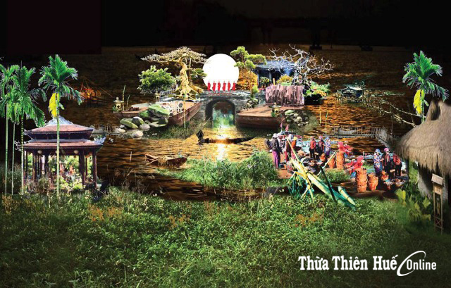 The stage is designed floating on the water, at the junction of Gia Hoi River - Trinh Cong Son Street. Audiences will see the images of Thien Mu Pagoda, Vy Da village with the green areca palms, banyan trees, landing stage, fish market, fishing boats, and so on. The familiar farming tools and fishing tools are transformed into art through the performances that are real but stylized.