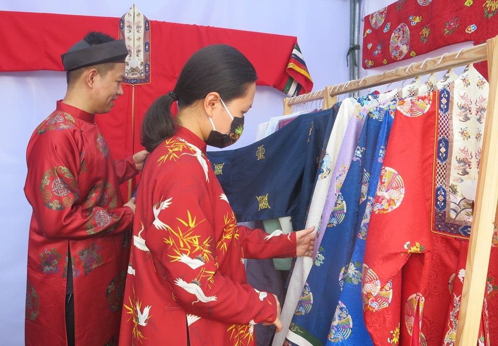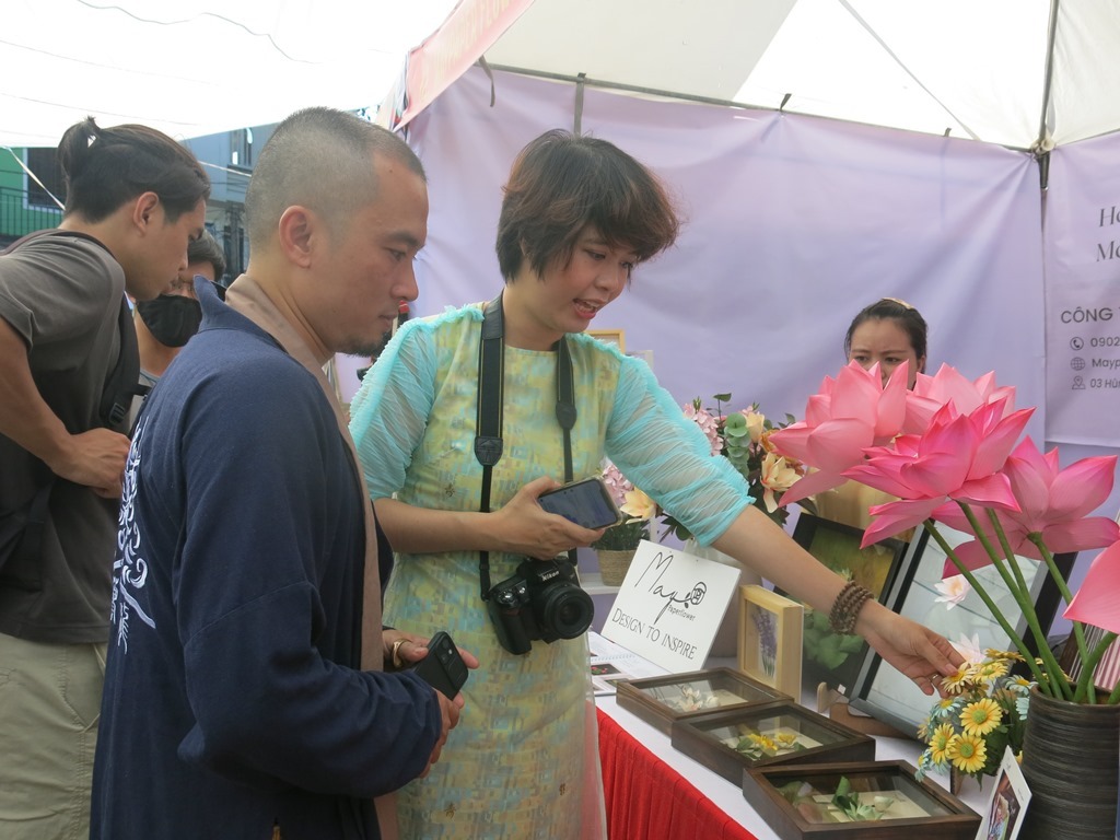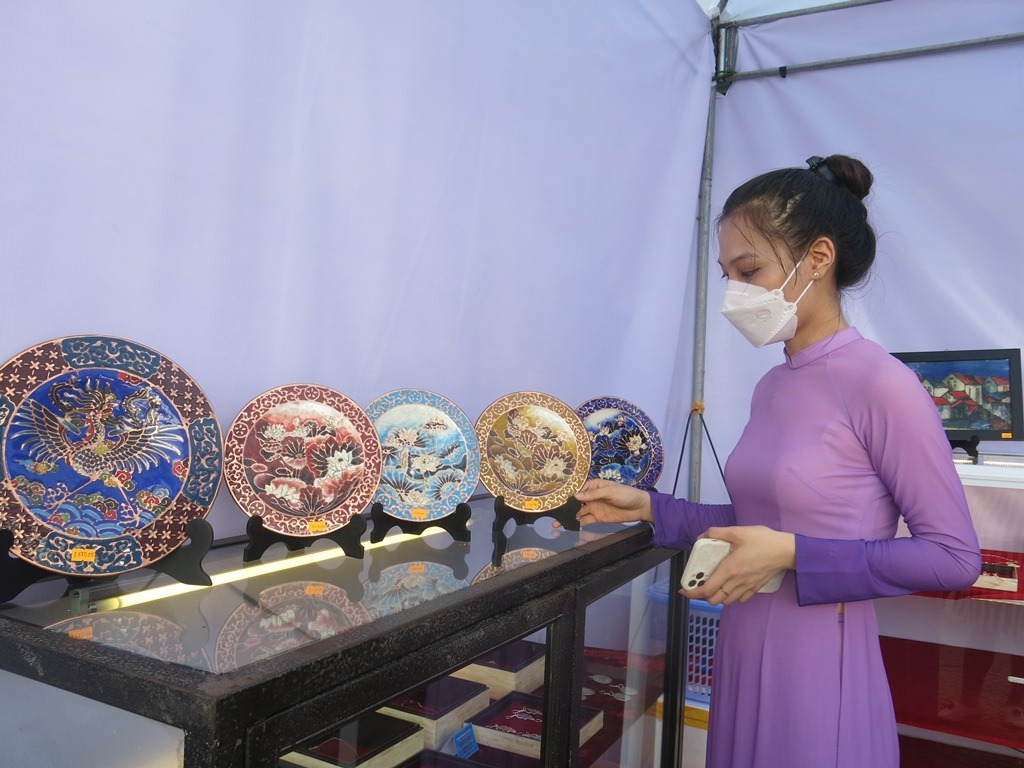 The fair space gathers 30 member units coming from three regions of the country such as Phap Lam Hue (Hue enameled Art), Maypaperflower, Dai Viet Patterns, Bleu de Hue, Hoa Tien Brocade, etc.