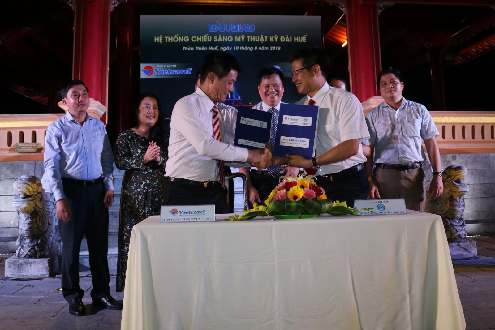 Representatives of Vietravel and Hue Monuments Conservation Center sign the handover and cooperation agreement
