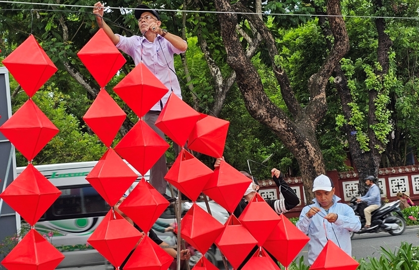 | Workers are putting up lights along Le Loi street on the morning of June 5th. |