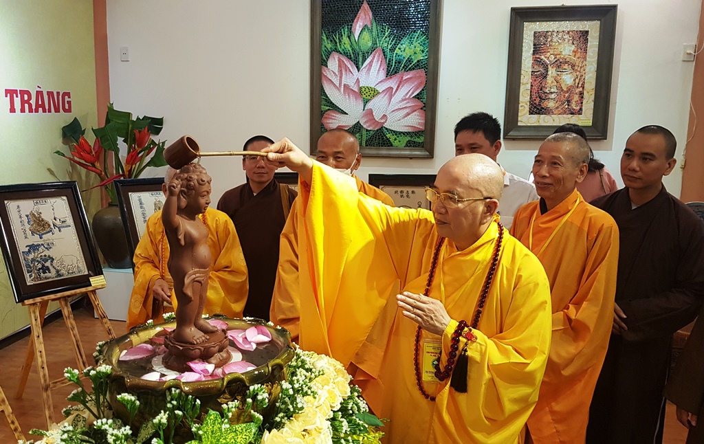 The Superior monks and Venerable performing the rite of Bathing Buddha inside the exhibition space