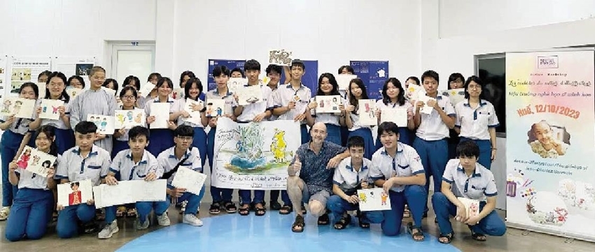 Also in October 2023, on the occasion of the 50th anniversary of diplomatic relations between Vietnam and France, in addition to the discussion on illustration drawing and practice for students of Thuan Hoa High School at the Hue French Institute, Jean-Charles Sarrazin also visited the Marguerite Duras French International School and the La Petite École in Ho Chi Minh City, as well as the French Institutes in Da Nang and Hanoi.