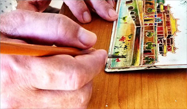 After that, a layer of color enamel is coated on the surface, then another layer of white enamel as the background of the painting. It is then heated at an appropriate temperature to settle the enamel coat. Patterns are then drawn; and the painting is heated again to finish.