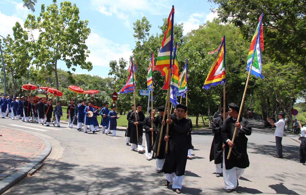 After the journey along the poetic river, the delegation stopped on the bank of the Perfume River, in front of An Hien garden house where the group continued to walk along the river bank to Quang Duc gate and perform the hand-over ceremonies