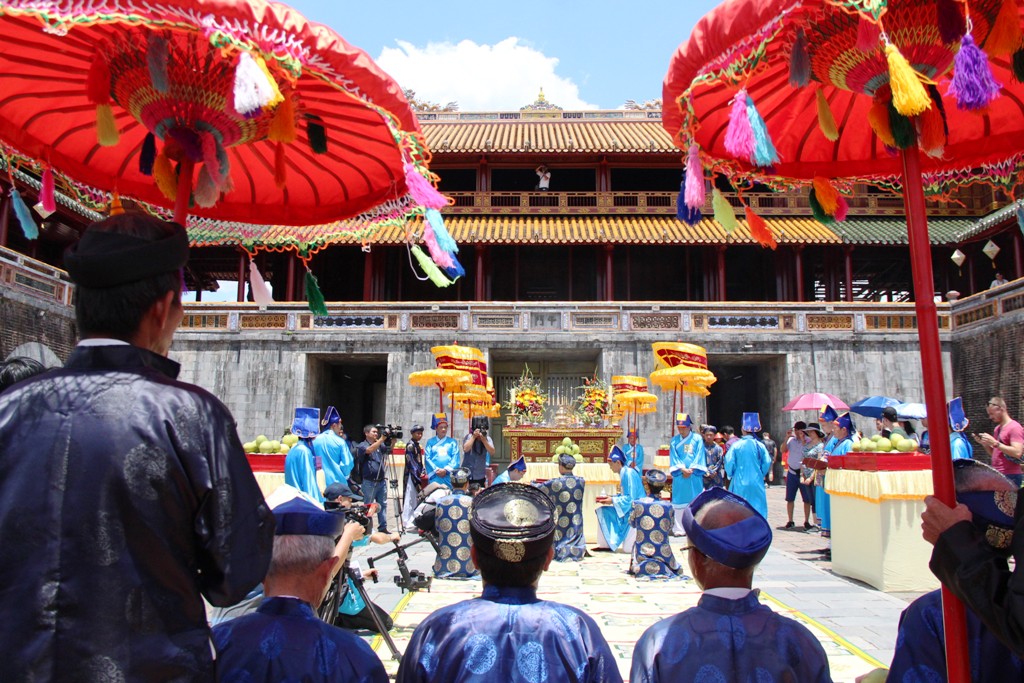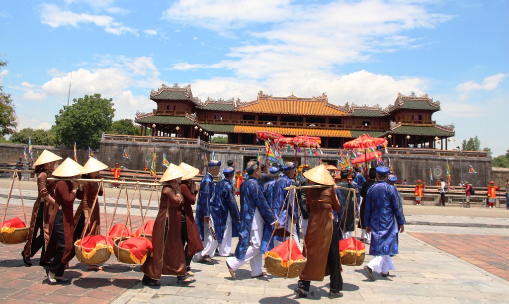 Reception ritual took place right at Ngo Mon Gate. Fruit offering ritual was carried out exactly as documented in historical records. On behalf of the royal Court, their guards would receive the offerings.