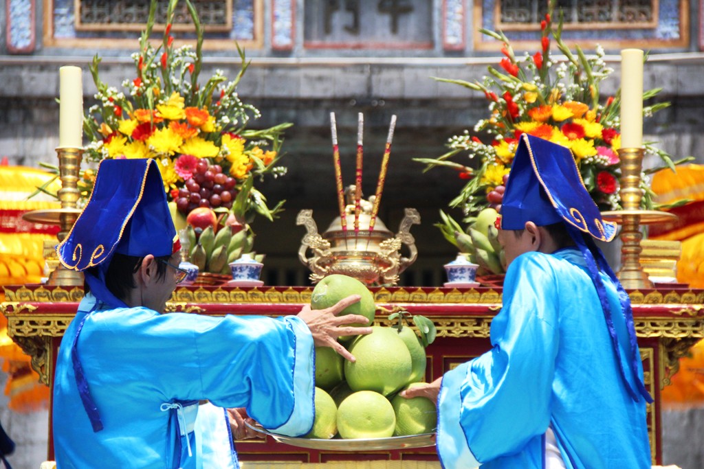 After the journey along the poetic river, the delegation stopped on the bank of the Perfume River, in front of An Hien garden house where the group continued to walk along the river bank to Quang Duc gate and perform the hand-over ceremonies (including Thướng Hương (incense-offering ritual), Thướng Tửu (wine-offering ritual), Thướng Quả (fruit-offering ritual), Nhận Quả (fruit-receiving ritual) to the palace’s guards at Ngo Mon Gate. After these rituals, thanh tra would be offered to Thế Miếu and Triệu Miếu (the ancestral temples).