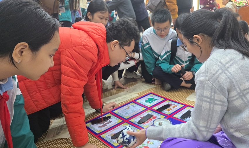 | Guiding students in printing with Nguyen Dynasty woodblock patterns |