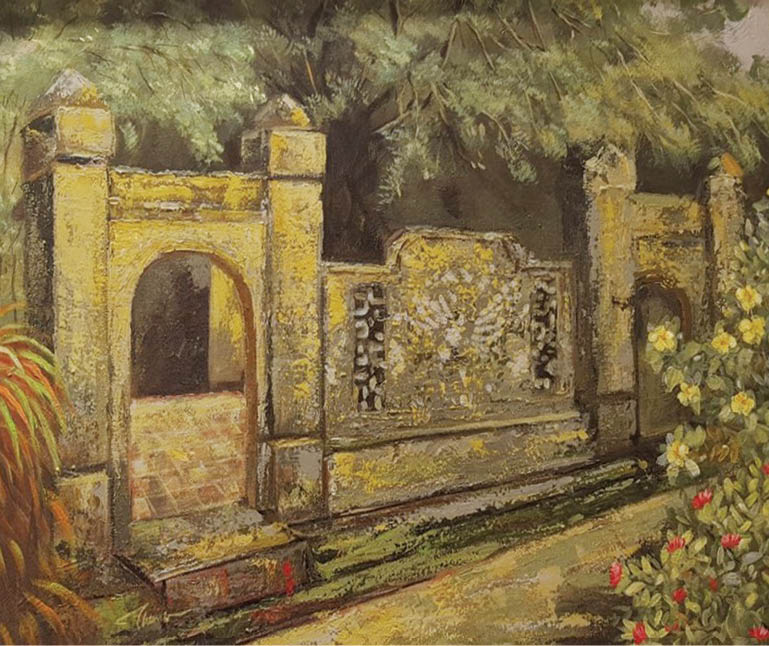With graphite and watercolor materials, Dũng has released his soul in the space of the gold apple temple with the shadow of the ancient tree in a fanciful and beautiful way. In that scene, the old soul of an ancient building is still quite intact and depicted in detail through each architectural objects to the surrounding setting.