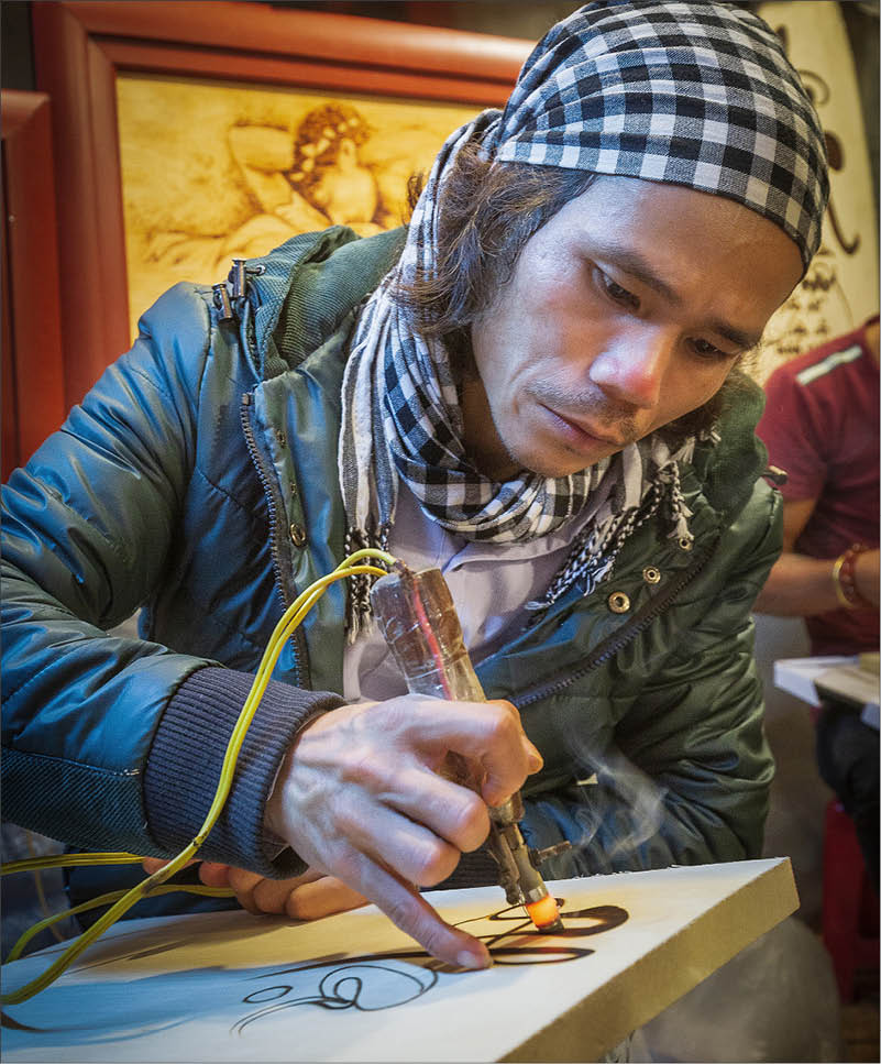 Heated by an electric current, the pen starts to glow and scorch the wood with burned marks, creating a fine pyrography artwork bearing the very characteristic signature of Hue. It is the talented Hue-based painter Nguyen Khanh Hoang who contributes to revive pyrography in Da Lat.