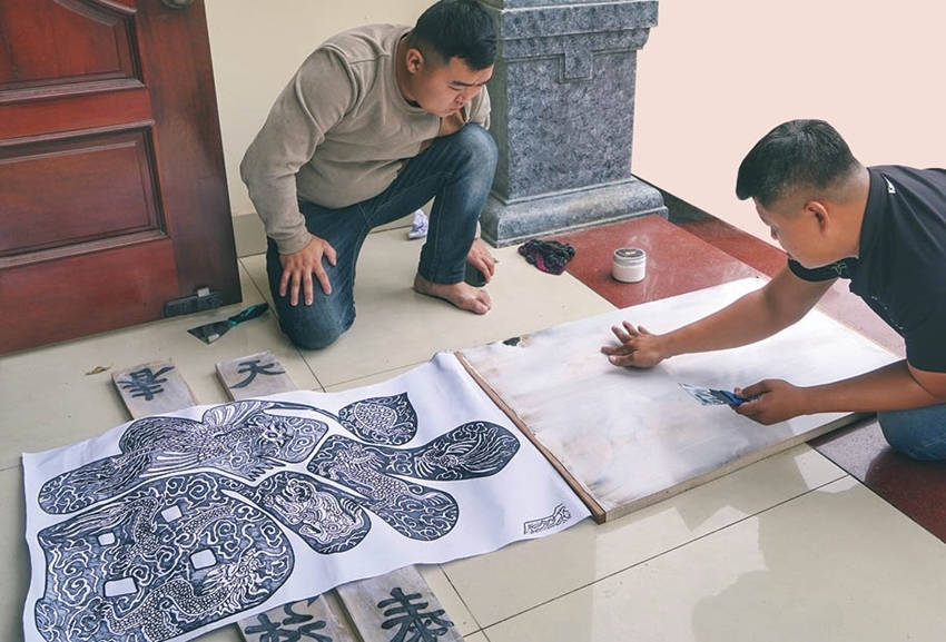 At the Thanh Lieu woodblock craft village, Quy Duc collaborated with Nguyen Cong Dat, the 17th-generation descendant of the craft lineage, to research and to restore woodblocks. After a long time looking for suitable timber, the most important well-carved woodblock bearing the character “Phuc” (“Happiness”) decorated with the four sacred creatures, dragon, unicorn, turtle and phoenix, was completed to the great joy of the whole team.