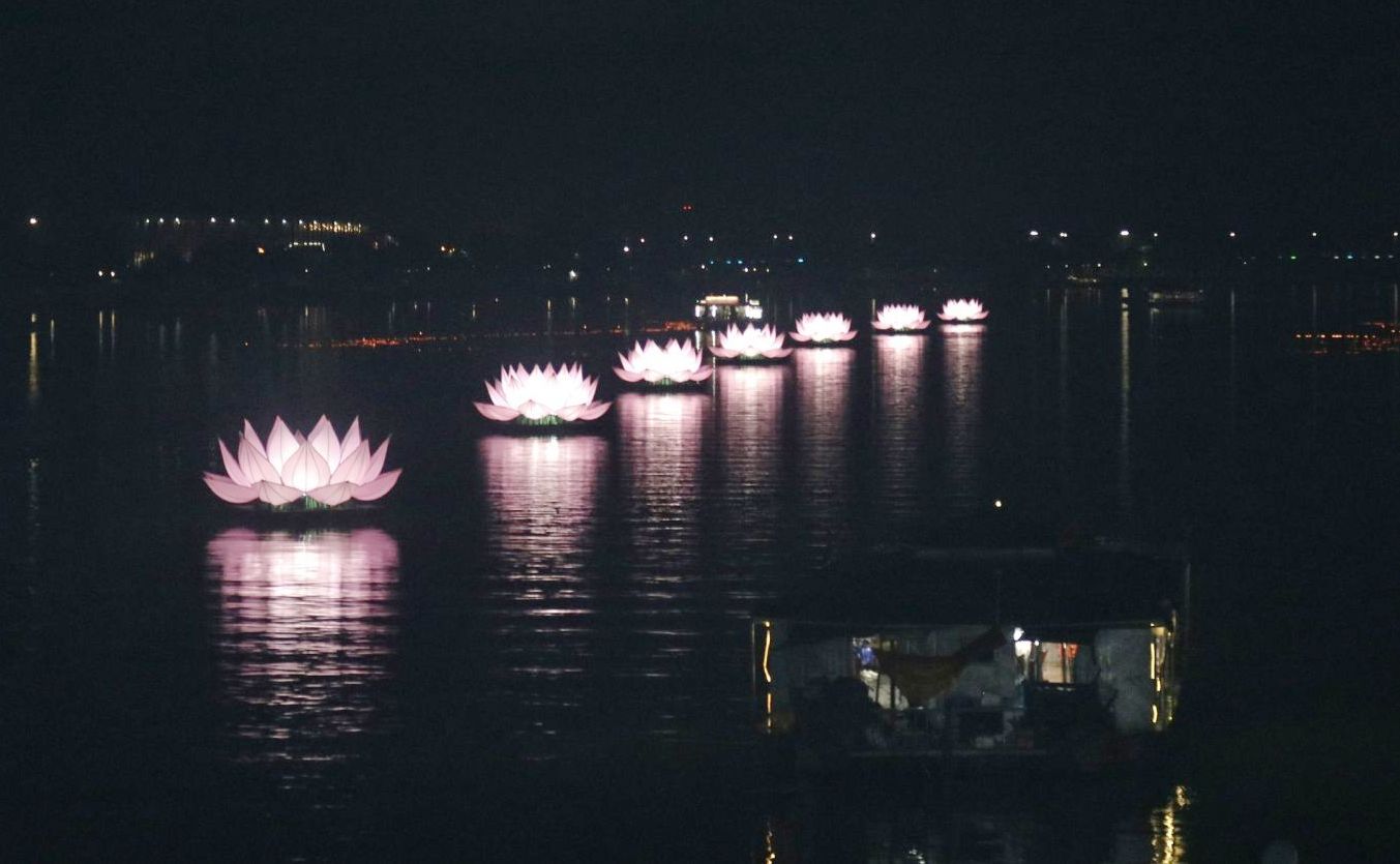 Seven lotus lanterns on the Huong River lit up to celebrate Buddha's birthday