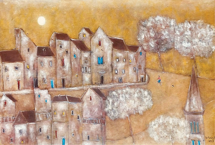 Le Thanh Phong, a journalist, upon appreciating those works, exclaimed: “Hoang Dang Khanh took me through the space of Hue and Da Lat, where there are pensive quarters, houses on the sloping hills, sad mountain towns bowing their heads under the clouds, ancient moss-covered walls, etc.” Even more impressive to this visitor, Khanh’s paintings always show a glimpse of a church tower, somewhere in which hymns seem to be sung in the afternoon mist or under the moonlight at night.