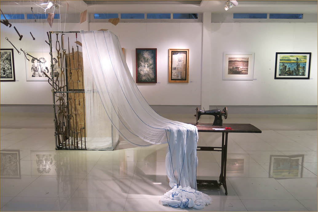 An unfinished cabinet with floating pieces, surrounded by wrenches, attached to an "old-fashioned" sewing machine by a sheet of thin cloth is the artist’s thought about family. The wrenches represent the father's working tools; the sewing machine is the mother's means of livelihood; the conflict between father and mother in the daily life leaves scars on their child's heart.