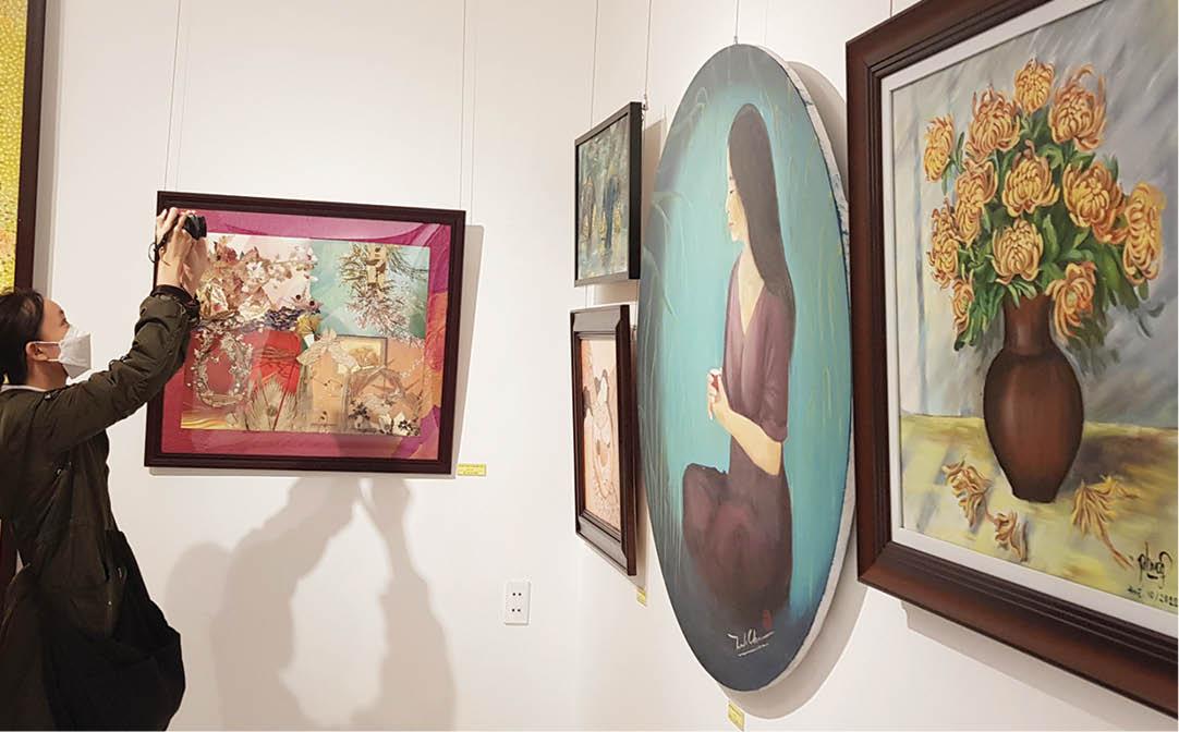 This year, the exhibition displays 45 works by 32 female artists, both professional and amateur, in diverse materials such as old paint, acrylic, lacquer, silk, synthetic materials, bamboo thread, graphics, etc. The paintings are arranged in a way that arouses the curiosity of those who drop by.