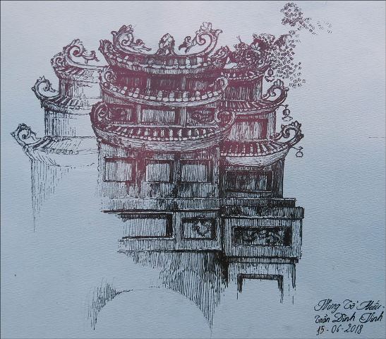 One of the sketches that many viewers enjoy is the one about the Citadel by Nguyen Dinh Viet, a 3rd-year student of Da Nang University of Architecture. The sketch is admired for its accurate depiction and the ancient look of one of the symbols of Hue Ancient Capital. “It took me only 3 hours to complete the sketch because I had a passion for ancient structures. I decided to sketch with a fountain pen to describe the raw look of the structure. It is my feelings about the heritage in the land of Huong River and Ngu Mountain,” said Viet.