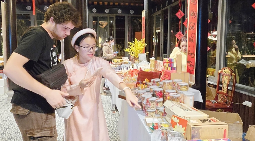 | Introducing traditional Hue products to international visitors at the Phu Noi Vu exhibition space |