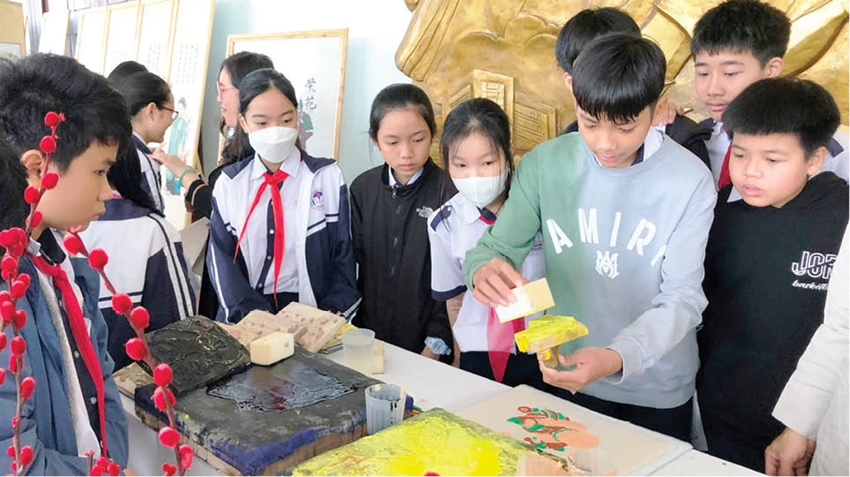 The students being enthusiastic about experiencing printing and drawing traditional painting