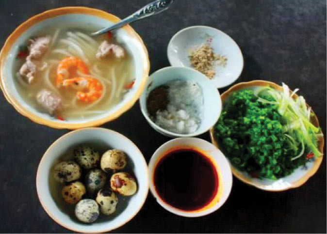 At present, there is mụ Đợi selling banh canh (another kind of noodle soup). The restaurant was originally located in an alley on Dao Duy Anh St. With no sign, but it has been existing for nearly 35 years and attracted lots of diners. The special thing of this restaurant is that noodle soup is cooked while the diner is waiting to make sure about the freshness. For that reason, it takes quite some time and the diner has to wait, hence the name of the restaurant (Mrs. Waiting). Food is kept very little, which proves suitable for Hue eating style. What is more, the diner can adjust the flavor of his bowl by adding spices provided such as salt, pepper, seasoning powder, chili paste, spring onion and coriander as he wishes.