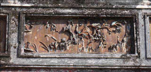 Whether it is folk, religious or royal architecture, in front of each construction, typically, there is always a screen in compliance with feng shui principles of Thuan Hoa residents. Besides masonry painting, masonry embossment and ceramic mosaics, the system of decorative panels on the two supplemental wings is the rarest, the most original and the most beautiful work that still exists. The main screen is 41m long; the two supplemental wings on the right and on the left are 10m long each. Just on one side, there are up to 55 decorative panels, embellished with ceramic mosaics, enameled ceramics and masonry embossment. The middle part of the screen contains 25 panels with images of flowers, fruits, leaves and vines; some other panels with precious objects such as the pen, the book, the gourd, etc. Each supplemental wing contains 15 panels, 8 of which are decorated with enameled ceramics in themes such as bát bửu (eight precious objects), bát quả (eight fruits), fairy tales and flowers and leaves. They all together form strips of decorative panels special in color, material and aesthetics.
