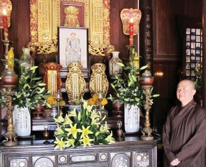 Venerable Thuong Chieu standing beside altar of the Ancestor who built Ba La Mat temple