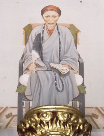 Back to the two portraits of Mr. & Mrs. Nguyen Khoa Luan (the artist’s parents in law). These two portraits were not painted in oils like other paintings by Le Huy Mien, but they were painted in pastel on papers (it is also called as fairy pastel). According to our observation, it is not 60x80cm as described in some documents, but it is about 40x60cm. Mr. Nguyen Khoa Luan in the painting was sitting cross-legged relaxedly on a large slightly-carved wooden armchair. With a white, short beard and bright eyes, he wore a red turban on his head, a grey Buddhist robe, and white pants. A long rosary was hung around his neck down to the seat. His left hand was holding the Bat Nha Buddhism sacred book in Han script, and his right hand a feathered fan. The elderly woman was depicted sitting on a carved wooden chair put on a light grey carpet, in front of a red limestone wall. Her hair was tufted; she had a high forehead and a thin face. She was wearing a black Ao dai, white pants, and black shoes. Her left hand was holding a feathered fan, her right hand resting on the arm of the chair. Behind her was a beautifully-patterned carpet (?) used as a background, which helped foreground the portrait. Both paintings are up to 115 years old, but they are still preserved perfectly; the colors and details of the paintings are still very bright. Nonetheless, the paper has some damages by termites. Venerable Thuong Chieu said that the temple did not have any special solutions to preserve them. Perhaps, the temple is always dry. From the past till now, the painting of the elderly man (Grand Master Vien Giac) has been placed on an independent stand and the painting of the elder woman has been hung on a wooden wall (not on a limestone or brick wall), so that mold is prevented. Furthermore, that the temple usually has incense smoke may be an accidental factor helping the paintings last a long time (?).
