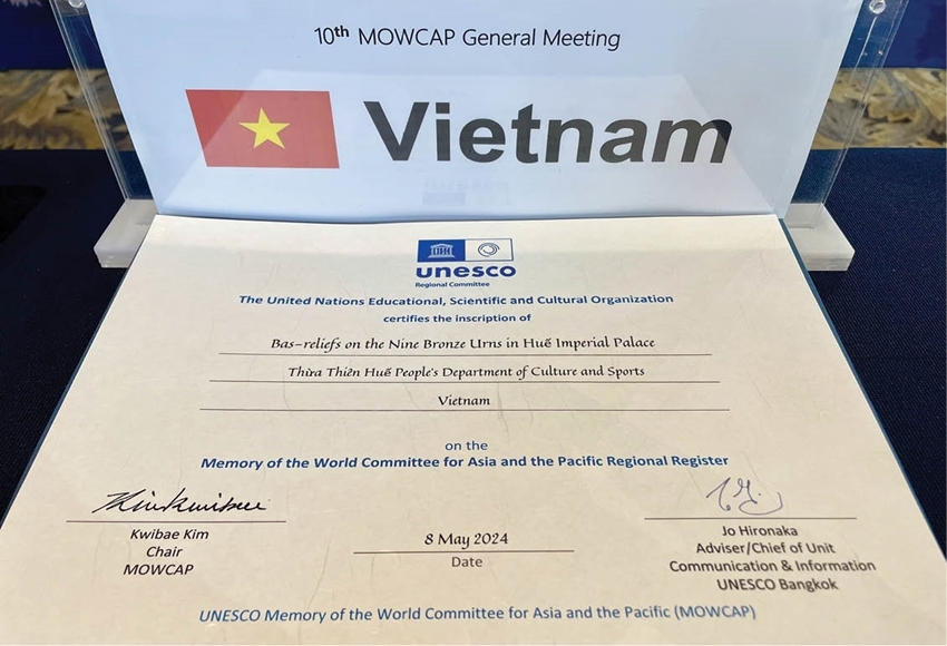 Thus, as of now, "The Engravings on the Nine Dynastic Urns of Hue Imperial Citadel" is Hue's fourth UNESCO-listed documentary heritage, following the Nguyen Dynasty Woodblocks (2009), the Nguyen Dynasty Official Documents (2014), and the Poems and Inscriptions on Hue Royal Architecture (2016).