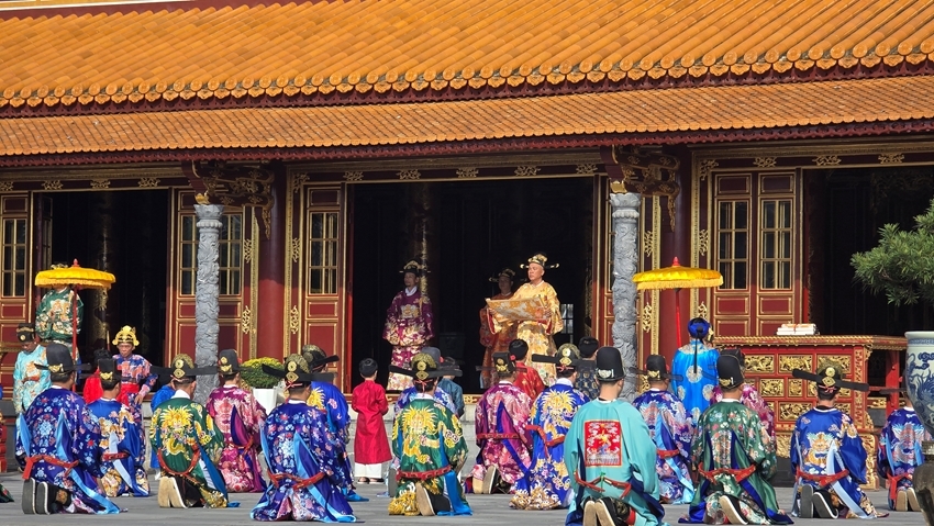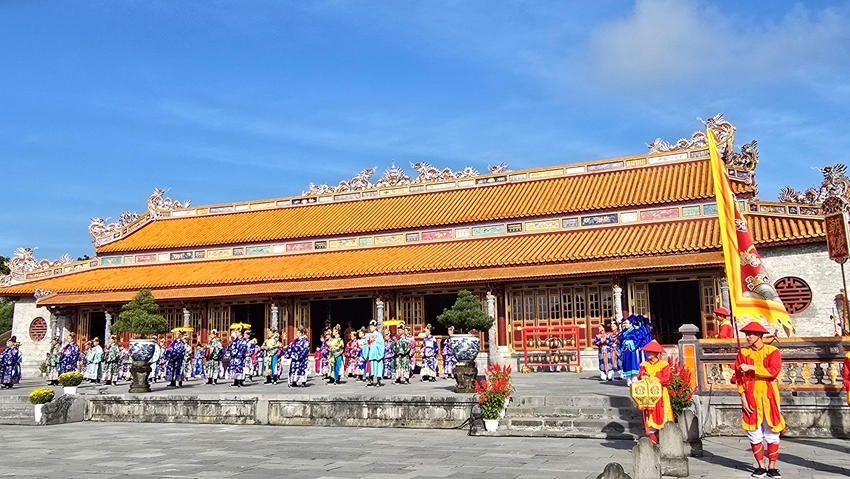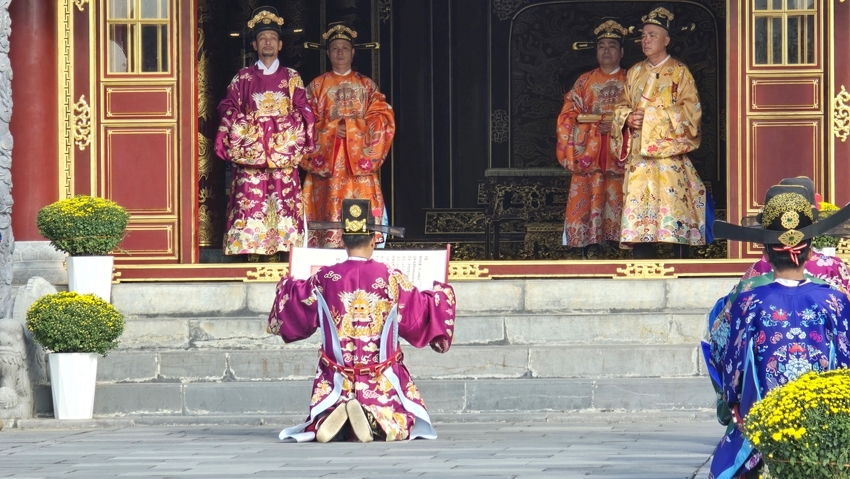 | After the major restoration of Thai Hoa Palace at the end of 2024, the Nguyen Dan court ceremony is now regularly reenacted on special occasions for visitors |