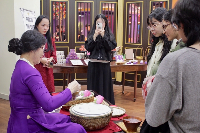 | Young people eagerly experiencing at the stall of making phan nu Hoang Cung (Imperial skin powder) |