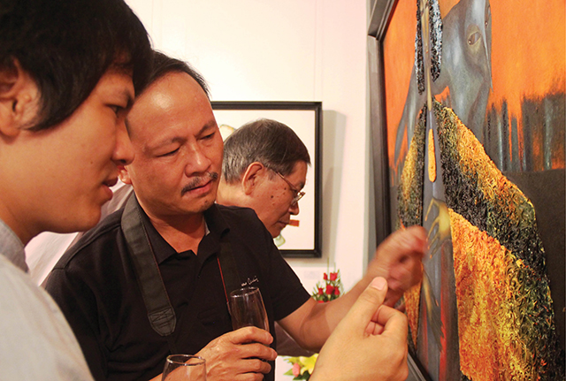 The writer and artist Le Minh Phong (on the left) is presenting his works at his painting exhibition.
